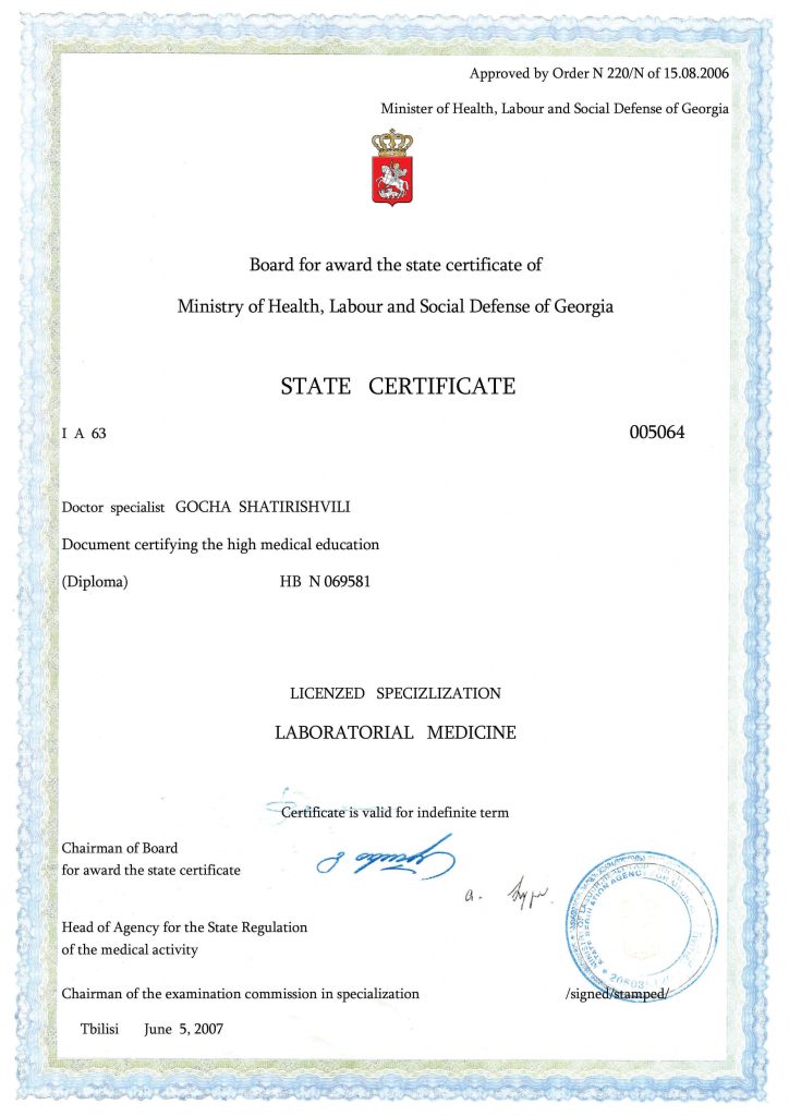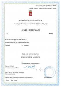 – 1991 – Graduation from Tbilisi State Medical University with honor (The Red Diploma). Qualification: Physician
