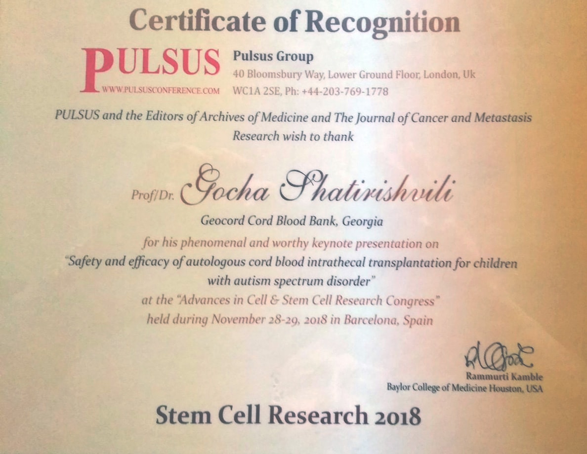 Dr. Gocha Shatirishvili is Medical Director of family Cord Blood Bank Geocord, Tbilisi, Georgia and Chief Scientific Officer of Autism Therapy Department, Tbilisi.