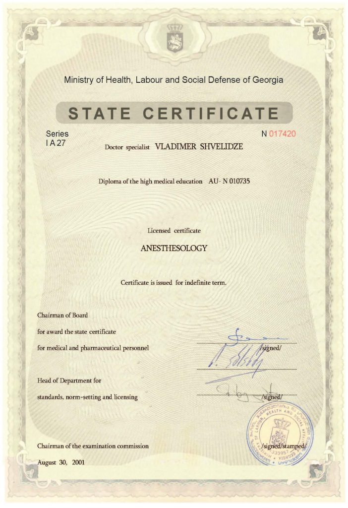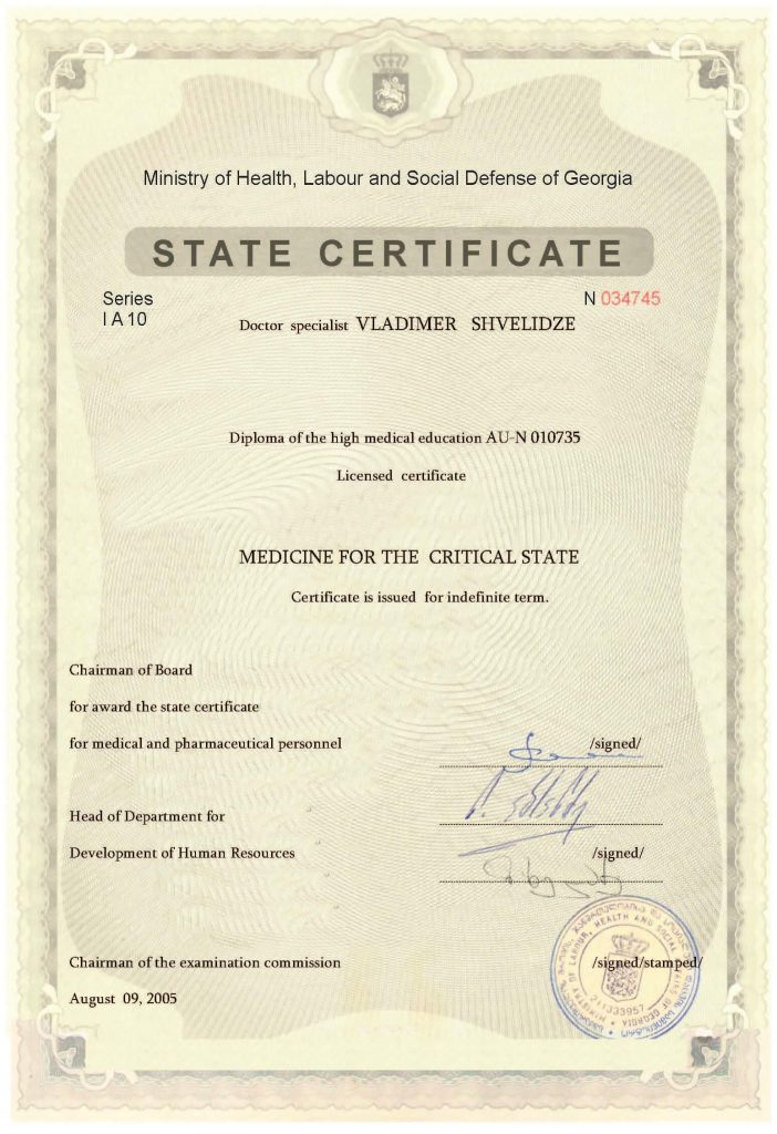 1994 Tsalenjikha Regional Hospital – anesthesiologist, resuscitologist